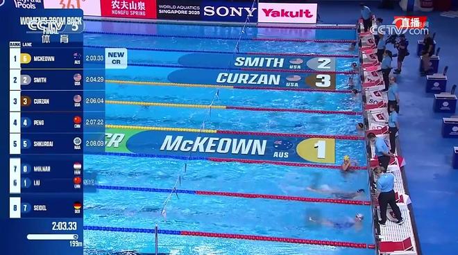 8月2日,2025世界泳联世锦赛产生女子200米仰泳金牌,澳大利亚凯莉-麦基翁以2分03秒33夺得冠军,同时打破世锦赛纪录。