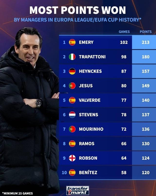 9月25日讯 德转盘点了欧联杯历史上主帅赢得积分最多纪录,其中埃梅里居首,本赛季执教维拉的他是否能夺得个人第五座欧联杯冠军值得期待。以下为具体榜单: