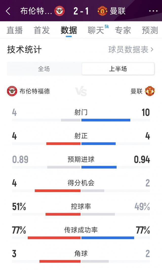 9月27日讯 本轮英超曼联对阵布伦特福德上半场战罢,布伦特福德暂时2-1领先,以下为双方半场数据对比: