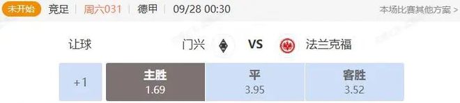 本场比赛,门兴将坐镇主场迎战目前德甲第六的法兰克福,法兰克福上一场在一场对攻大战中以3-4不敌柏林联合,止住了此前五战四胜的好势头,本场比赛,球队力求胜利来提振士气,不过,主力后卫柯林斯和克里斯滕森的受伤,使得球队的后防线捉襟见肘,而门兴一方,球队前场头牌克莱恩丁斯特已经恢复训练,而本赛季新援塔巴科维奇上一场找到比赛感觉,成功完成绝平,此消彼长,结合场地优势,虽然法兰克福保持着对门兴连续9场不败的绝对优势战绩,但个人看好门兴可以凭借主场优势,守住底线拼到积分。