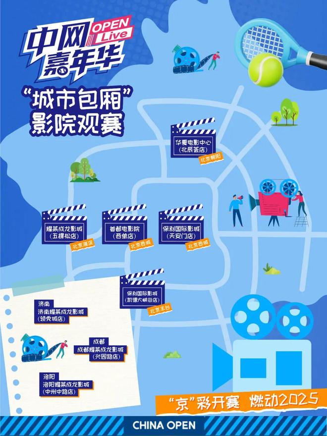 对于追求专业观赛体验的球迷,中网在全国8家影院设置“城市包厢”,提供半决赛和决赛的高码流专属信号。这些影院观赛点营造符合网球礼仪的专业氛围,随票附赠专属纪念票根,并有机会获得球星签名海报和限定款纪念品,让球迷享受“包厢级”观赛体验。