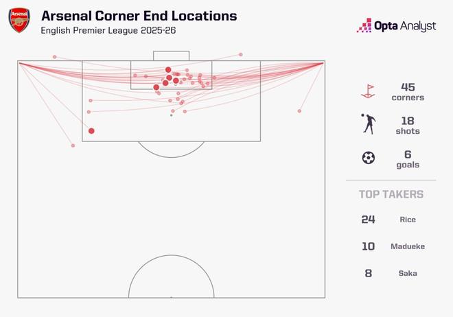 如果单看本赛季,阿森纳在英超已经获得了45次角球,比任何球队都至少多出4次,其中赖斯主罚了超过一半(24次)。这些角球带来了18次射门,6粒进球。换句话说,阿森纳的进攻角球里有超过三分之一能转化为射门,而这些射门又有三分之一能转化为进球。