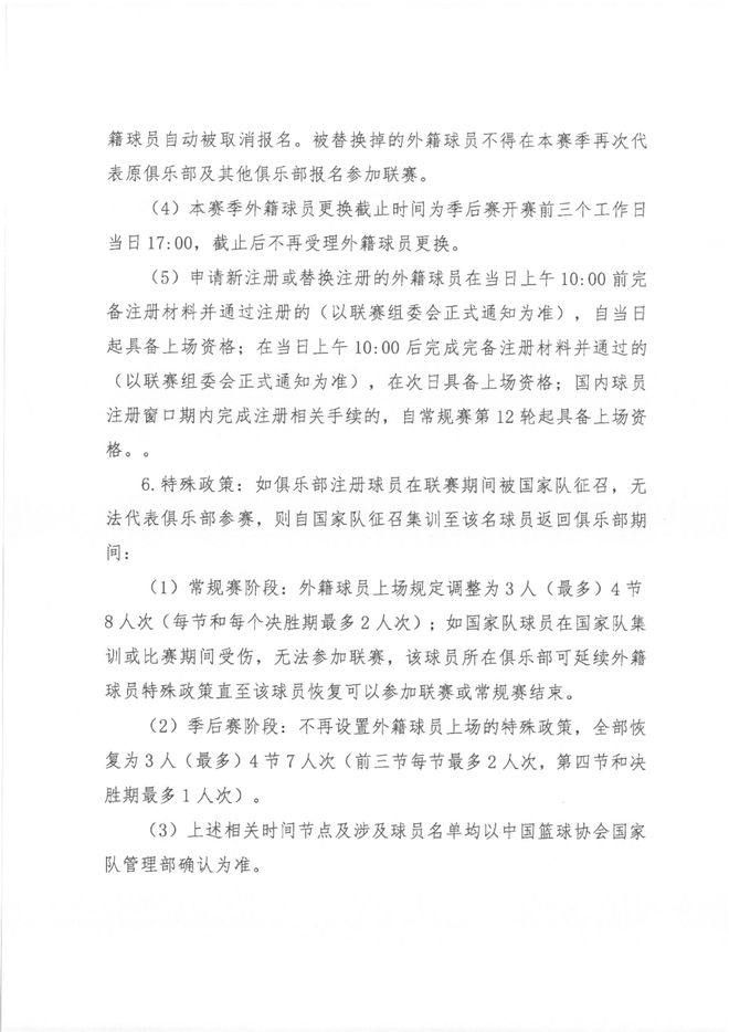 最后还有个“ 特殊政策 ”,是关于国家队球员的:假如球员在联赛期间被国家队征召,在此期间,该俱乐部的外援上场人次调整为“3人4节8人次(每节和每个决胜期最多2人次)”,仅限常规赛阶段。