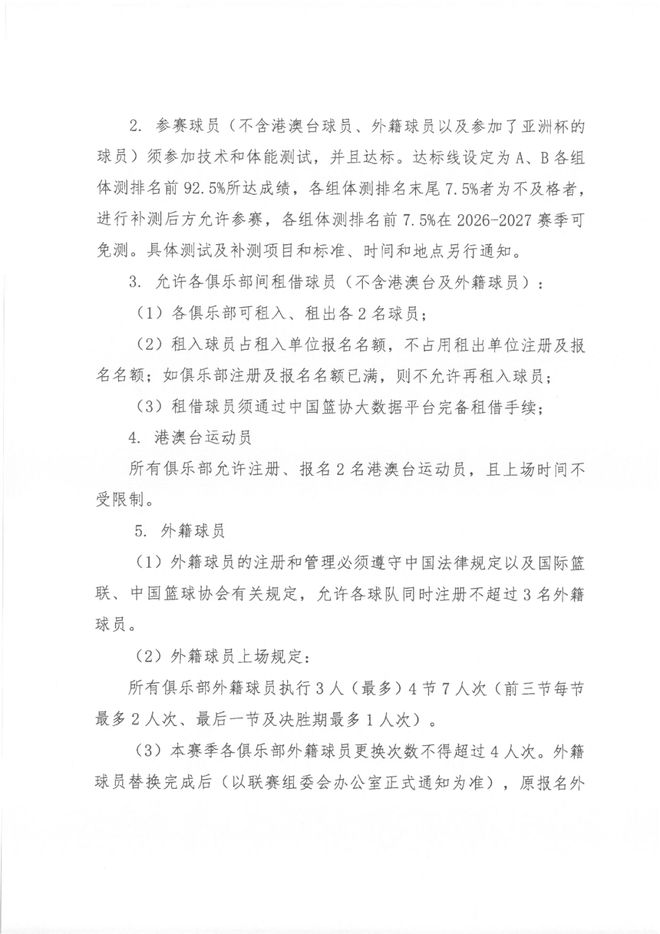 港澳台运动员方面,所有俱乐部允许注册、报名2名,且上场时间不受限制。还有比较关注的外援政策,每支球队允许同时注册不超过3名外籍球员,上场则是4节7人次,前三节每节最多2人次、最后一节及决胜期最多1人次,至于更换次数不得超过4人次。
