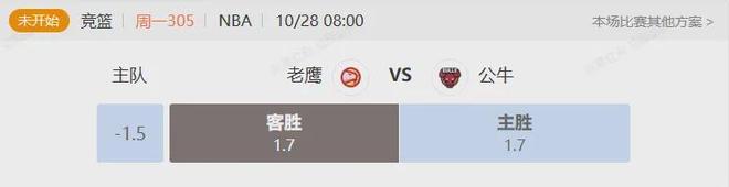 主队公牛上赛季排名NBA东部第十,客队老鹰上赛季排名NBA东部第九伤停信息:公牛:科比怀特小腿受伤确定伤缺,柯林斯舟骨受伤确定伤缺,吉迪手指受伤出战成疑老鹰:杰伦约翰逊脚踝受伤确定伤缺,波尔津吉斯流感出战成疑,里萨谢脚踝受伤出战成疑本场比赛看好老鹰方向理由如下:1.这场比赛给的是公牛在主场让1.5分,俩队实力差距不大上赛季排名也是紧挨着,本赛季公牛2胜0负分别赢了魔术和活塞,老鹰本赛季是1胜俩负,状态方面公牛更好,1.5是给的主场的分俩队实力相当这个平手pan都有机会2.公牛本赛季阵容没有太大变化基本延续了上赛季的阵容也延续了上赛季的问题,组织进攻方面比较科比怀特在场比赛科比怀特依旧伤缺还能不能延续打魔术时组织进攻效率是个问题,老鹰本赛季阵容变动较大流失了曼恩卡佩拉等球员签下了沃克肯纳德波尔津吉斯在内线补充了挺多阵容厚度较好,尤其老鹰角色球员签入较多在主力下场的时间可能会比公牛打的更好