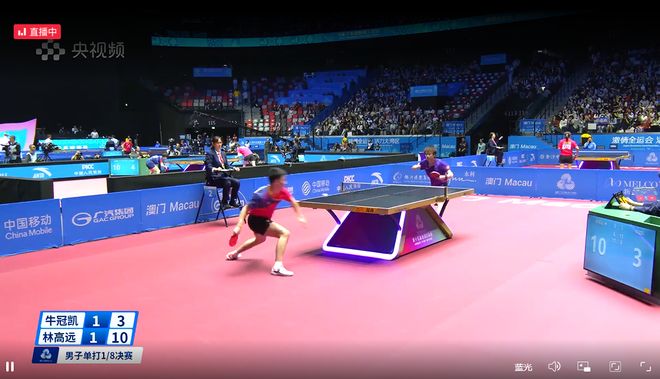 乒乓球男单1/8,广东队的林高远vs牛冠凯,晋级男单八强,比分:8-11、11-3、11-3、7-11、11-8、13-11。林高远下轮将对阵王楚钦和黄镇廷的胜者。