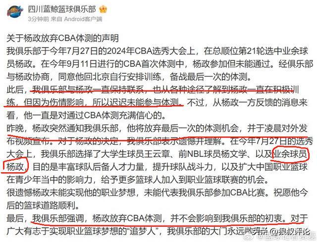 四川男篮也在官方声明当中提到杨政是“业余”球员等争议字眼,涉及到迟迟未能通过体测引发比较大的争议,甚至一度成为CBA选秀最大争议话题。