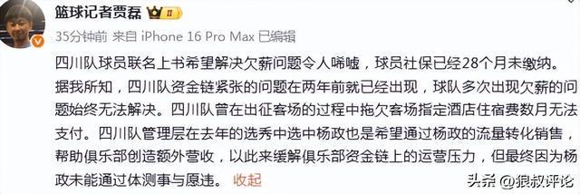 北京时间11月19日,根据篮球记者“贾磊的”报道,四川队球员联名上书希望解决欠薪问题令人唏嘘,球员社保已经28个月未缴纳。据我所知,四川队资金链紧张的问题在两年前就已经出现,球队多次出现欠薪的问题始终无法解决。